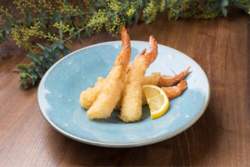 2. エビに水溶き天ぷら粉、米粉のクスクスの順につけ、170℃の揚げ油で揚げます。
