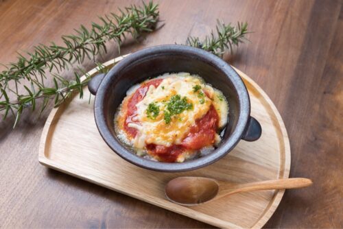 2. 耐熱皿に①・トマトソース・とろけるチーズの順にのせ、200℃のオーブンで7~8分焼き、パセリをちらす。