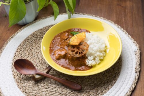 米粉のクスクスは、カレールーとも相性が合います。米粉のクスクスにお湯を加え混ぜ、レトルトカレーをよそうことで直ぐに美味しいカレーに仕上がります。