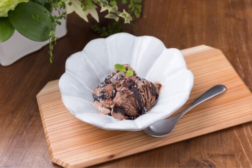 - チョコレートアイス・チョコソースを器に盛ります。米粉のクスクスをトッピングしミントを添えます。